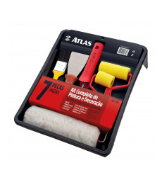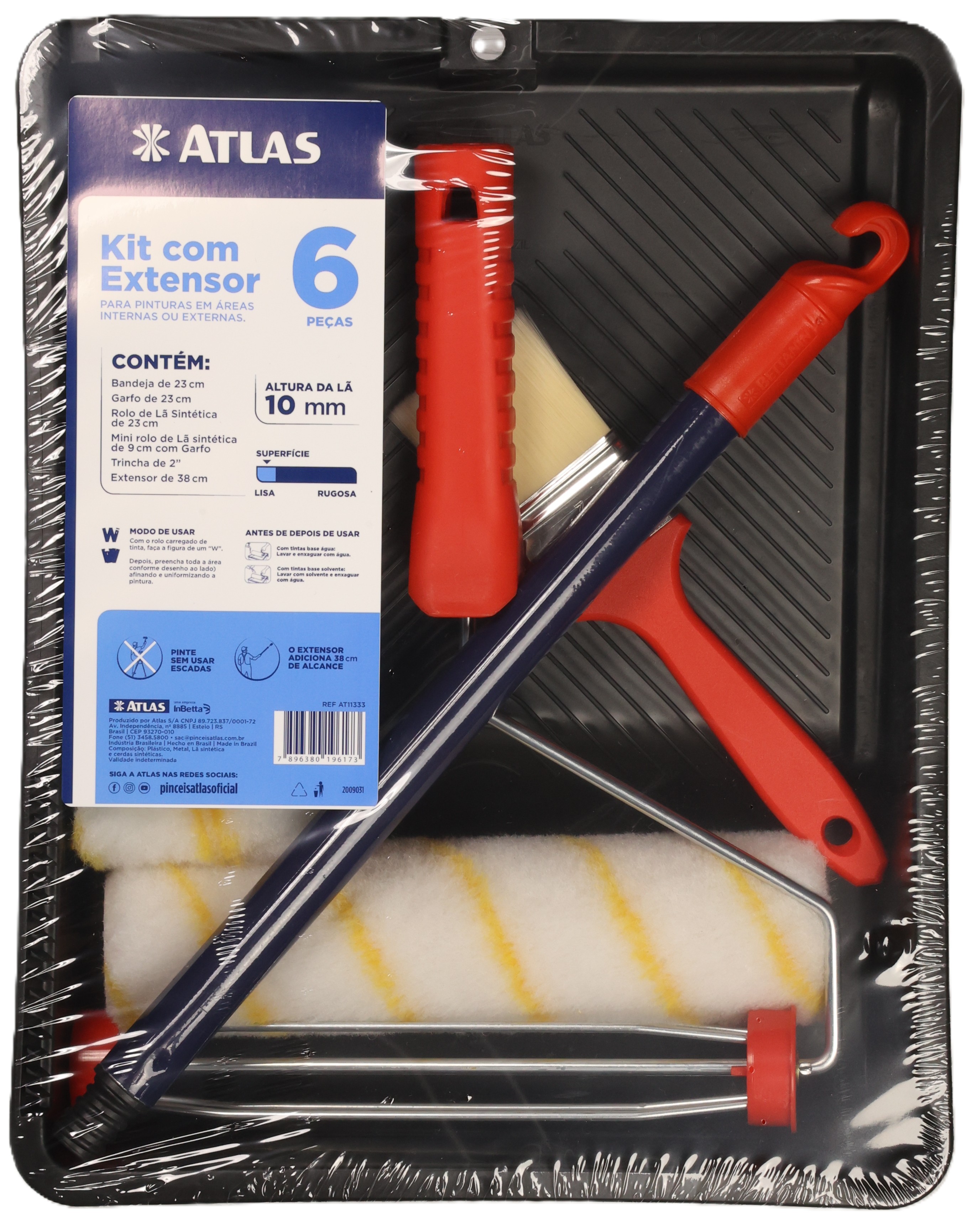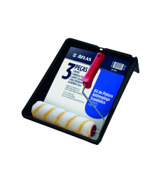 Bandeja de pintura (1523P), brocha de 2" (AT315/5), mini extensor, mini rodillo de 9 cm (AT773/9), mango para rodillo tipo jaula (400/23SR) y rodillo de lana de poliéster de 23 cm (773/10).